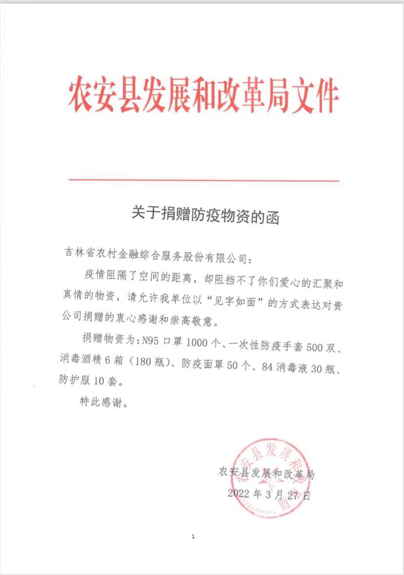 3月26日,吉農(nóng)金服公司向農(nóng)安縣發(fā)改局(金融辦)捐贈價值5000元的防疫物資。