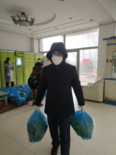 圖為志愿者孫洪偉分發(fā)蔬菜,發(fā)放抗原檢測試劑
