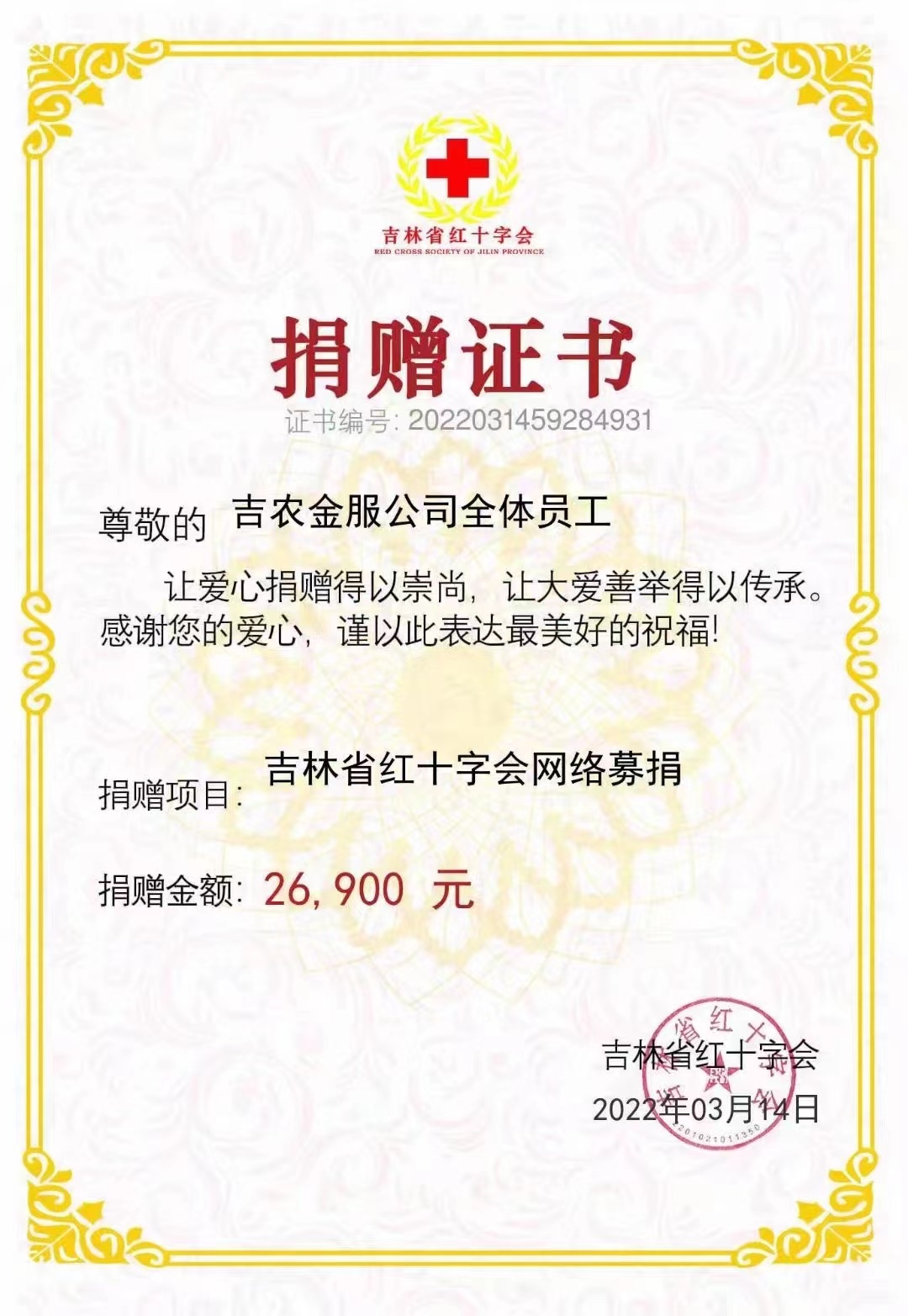 3月14日,吉農(nóng)金服公司177名員工向吉林省紅十字會和長春市紅十字會捐款2.79萬元(含員工個人捐款1000元)。