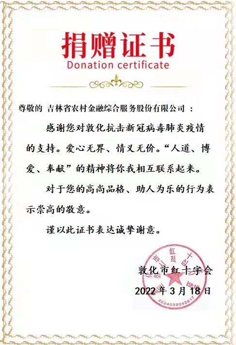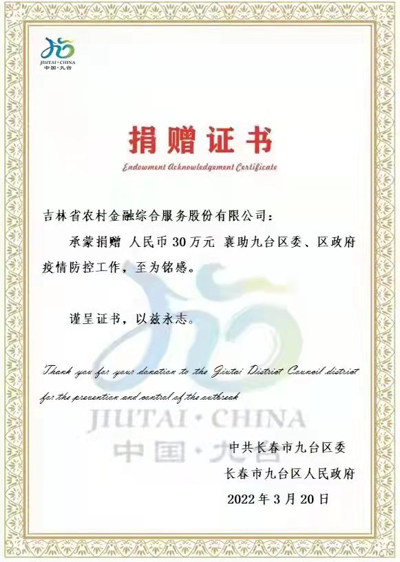 3月17日,吉農(nóng)金服公司向九臺區(qū)和敦化市政府捐款50萬元。